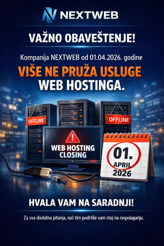 Kompanija NEXTWEB obaveštava sve svoje korisnike da od 01. aprila 2026. godine više neće pružati usluge WEB hostinga. Ova odluka […]
